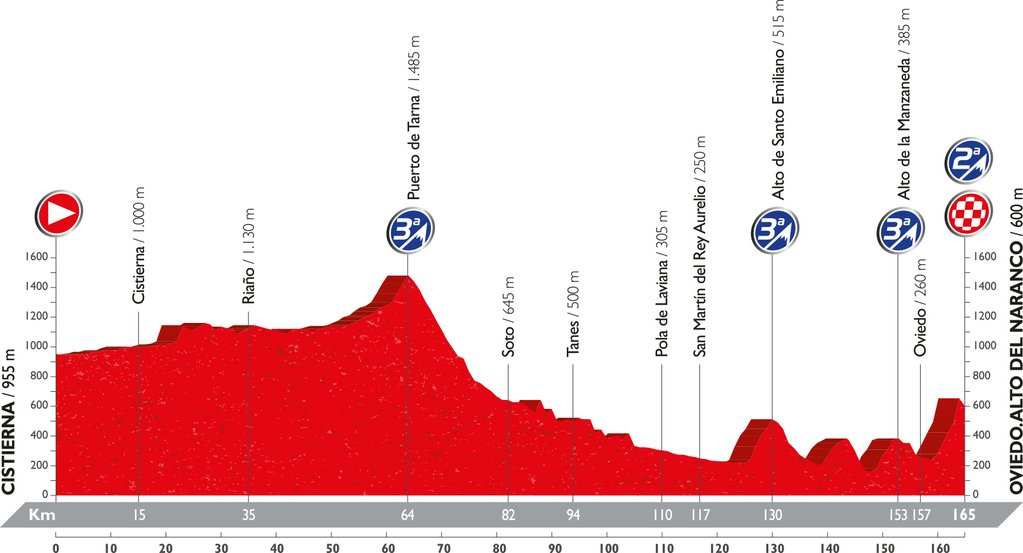 La edición 71 de la Vuelta arrancará con una crono por equipos que determinará el primer líder, que seguramente no durará mucho, ya que en los primeros días dos durísimos finales darán el primer arreón a la clasificación: Mirador de Ézaro (2 km al 13,1% con un máximo del 29%) y La Camperona (8,3 km al 7,5% con un tope del 24%). Una primera semana que además finalizará con la clásica subida al Alto del Naranco.